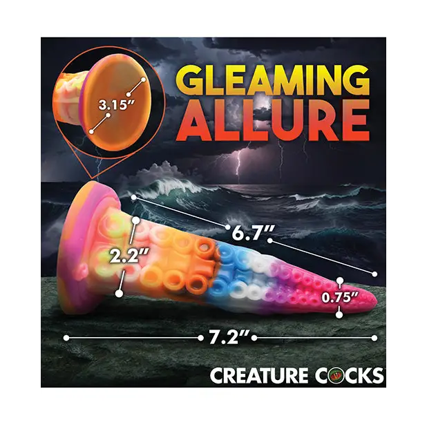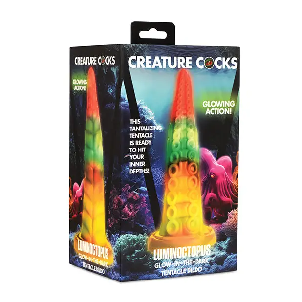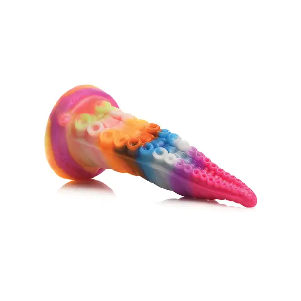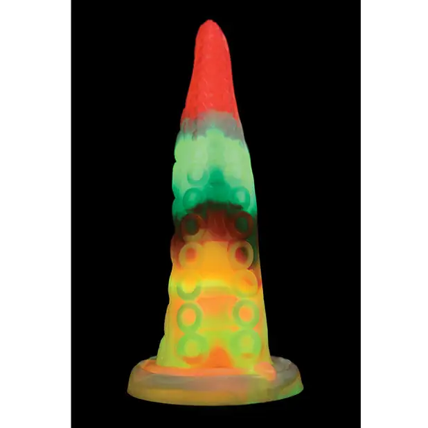 <p>This tentacle is brightly colored during the day and glows bright in the night! It has a rainbow-sherbert array of colors and when you charge it with UV light from a flashlight or sunlight, it glows a bright neon green, cherry red, and golden-yellow in the dark. The tapered tip makes insertion easy and then the shaft gets gradually wider and bigger to stretch you the deeper you go. Textured with suckers and a tongue-like backside, you'll enjoy every inch! Made from premium, phthalate-free silicone, it has a firm core and soft, silky surface. Explore every sci-fi, fantasy, roleplay, or cosplay scene you want with this epic adult toy! The wide base is anal-safe, has a suction-cup for hands-free play, and strap-on harness compatible! Play alone or with a lover! Use only with water-based lubricants for best results. After play is over, wash the dildo with warm water and soap and use a toy cleaner to spray clean. Wipe dry and store in a cool, dark place out of direct sunlight.</p>