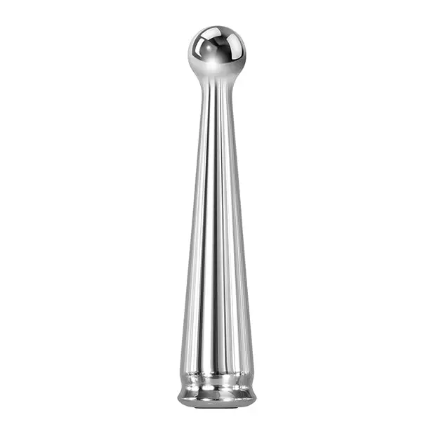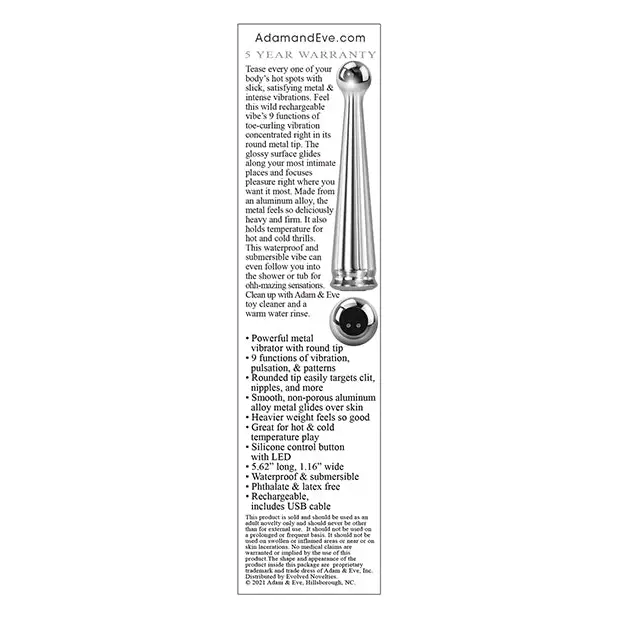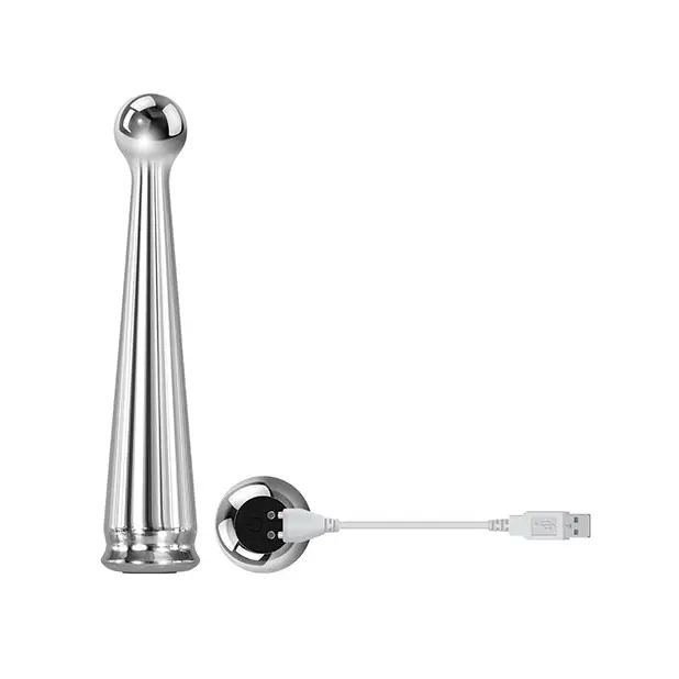 Tease every one of your body's hot spots with slick, satisfying metal & intense vibrations. Feel this wild rechargeable vibe's 9 functions of toe-curling vibration concentrated right in its round metal tip. The glossy surface glides along your most intimate places and focuses pleasure right where you want it most. It holds temperature for hot and cold thrills. This waterproof and submersible vibe can even follow you into the shower or tub for ohh-mazing sensations.